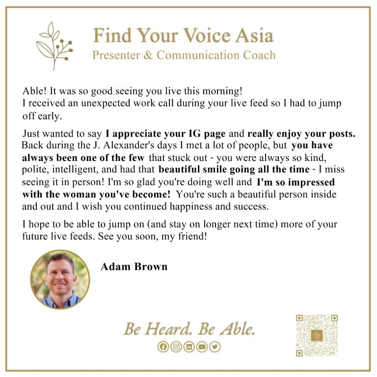 "Speaking in front of a crowd is my challenge, it’s completely different from speaking in person. I think many people like me always feel nervous when public speaking. When I first saw K.Able video hosting those events or her professional presentation. I think she has excellent speaking skills. She guided and coached me on how to go with the flow. For people who want to improve their speaking skills or overcome their barriers with her tips and techniques would benefit you."
